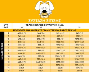Η ποσότητα τροφής εξαρτάται από την ηλικία, το βάρος και το επίπεδο δραστηριότητας του κουταβιού. Να παρέχετε πάντα φρέσκο πόσιμο νερό. Οι προτεινόμενες ποσότητες στη συσκευασία αποτελούν ενδεικτικό οδηγό.