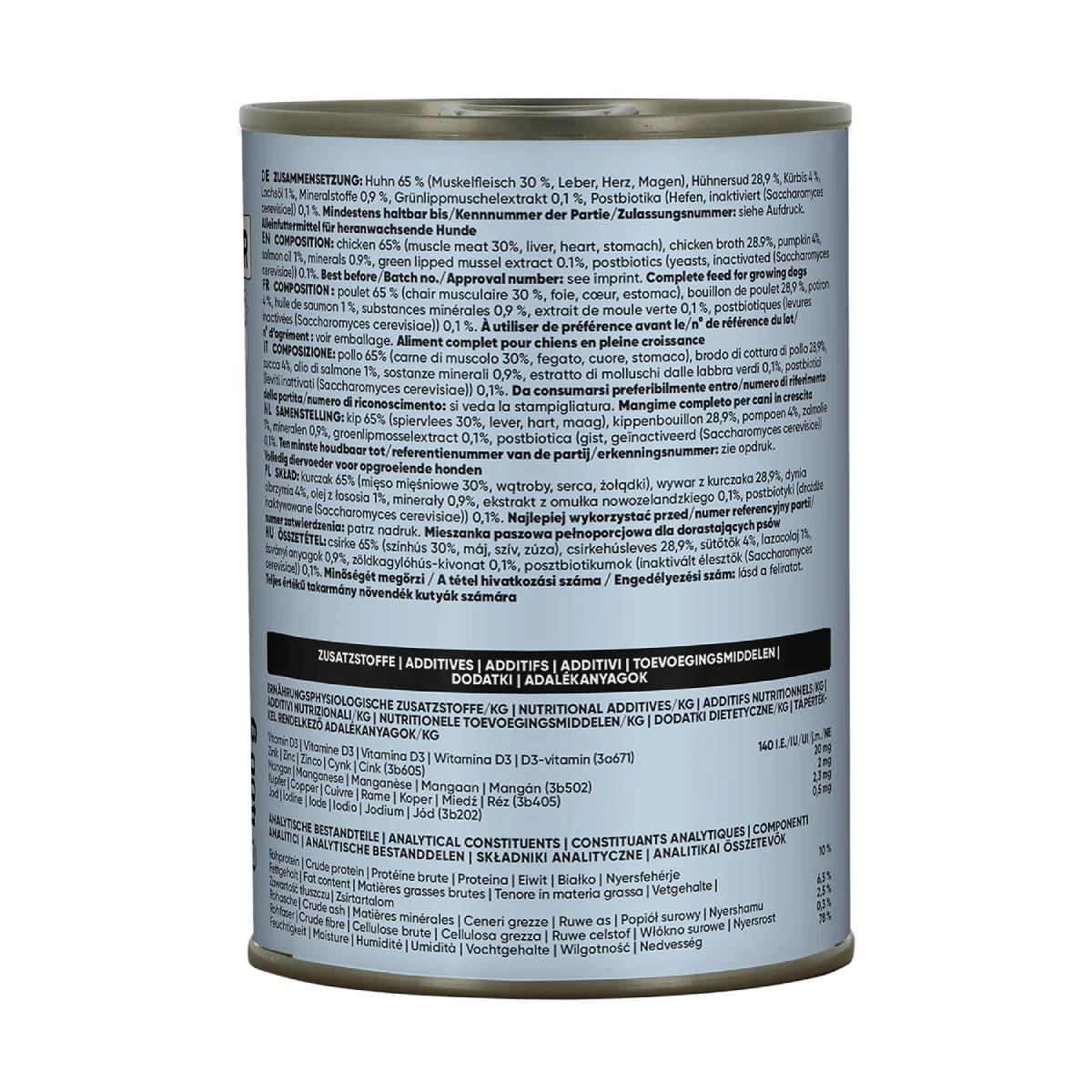 Η συνταγή είναι χωρίς δημητριακά, γεγονός που την καθιστά ιδιαίτερα εύπεπτη, ιδανική για κουτάβια με ευαίσθητο στομάχι. Παράλληλα, περιλαμβάνει μεταβιοτικά, που συμβάλλουν στην καλή λειτουργία της πέψης, στη φυσιολογική υποστήριξη του ανοσοποιητικού συστήματος, καθώς και στη ζωτικότητα και την καθημερινή δραστηριότητα. Περιέχει επίσης πρασινόχυλο μύδι, που συμβάλλει στην υγιή ανάπτυξη και υποστήριξη των αρθρώσεων κατά τη φάση της ανάπτυξης.