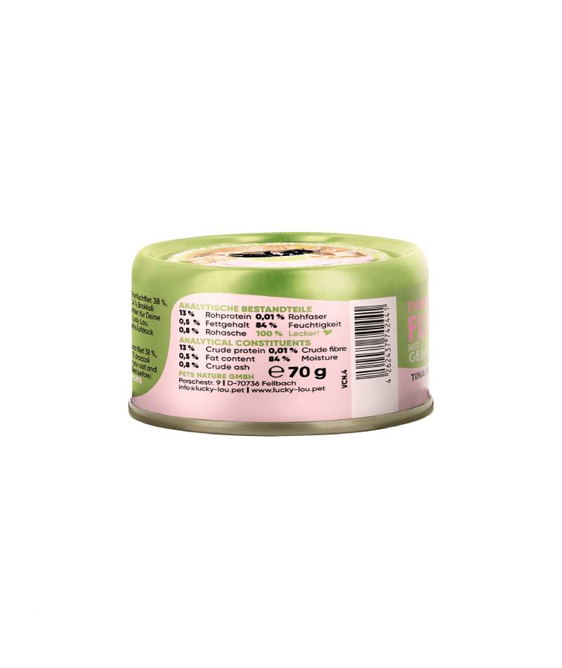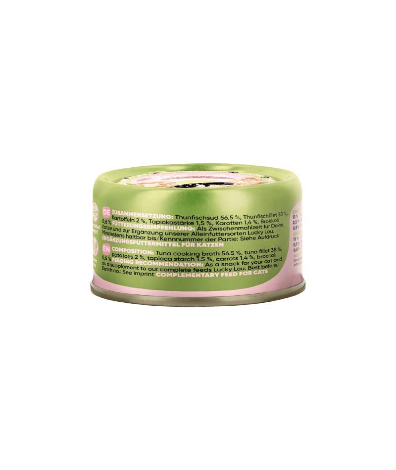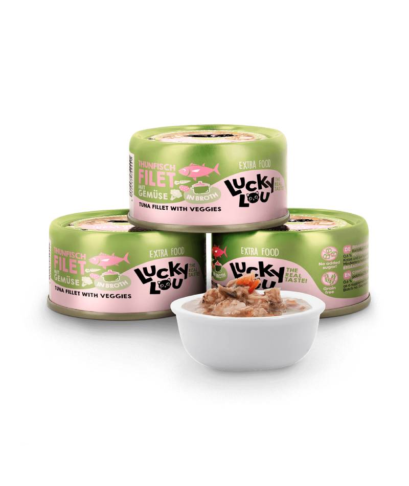Σε εμάς τις γάτες μας αρέσει να μας χαϊδεύουν και μας αρέσει το extra φαγητό. Η σειρά Lucky Lou ExtraFood με έξτρα νόστιμο φιλέτο κρέατος ή ψαριού διατίθεται σε δύο επιλογές: σε ζελέ και σε ζωμό. Μεγάλη ποικιλία φιλέτων ψαριού, όπως φιλέτο σολομού, γαρίδας και τόνου, αλλά και φιλέτο κοτόπουλου εξαιρετικής ποιότητας, με φυσικά συστατικά, χωρίς δημητριακά, χωρίς ρύζι, χωρίς πρόσθετη ζάχαρη. Εξαιρετικά νόστιμο με πολύ κρέας και ψάρι! Ειδικά οι λάτρεις των ψαριών θα καταλάβουν την αξία της σειράς Lucky Lou ExtraFood, γιατί έχουν τόνο συνδυασμένο με πολλές νοστιμιές, όπως για παράδειγμα με σολομό, γαρίδες ή φιλέτο κοτόπουλο. Υπάρχει και τόνος με μήλο ή λαχανικά. Και για τις γάτες που δεν τους αρέσουν τα ψάρια, υπάρχει το φιλέτο κοτόπουλου Extra Food. Παρεμπιπτόντως, η συμπληρωματική τροφή Lucky Lou Extra Food κατασκευάζεται στην Γερμανία και διατίθεται σε 11 διαφορετικές ποικιλίες σε συσκευασίες των 70gr. Φυσικά, τα εξαιρετικά συστατικά είναι φιλικά προς τις γάτες: Grain Free – Gluten Free – GMO Free – Sugar Free.